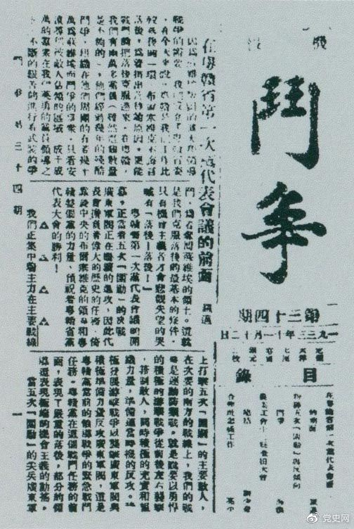 1933年11月5日,劉少奇主持中央蘇區(qū)農(nóng)業(yè)工會十二縣查田大會,并作總結(jié)報告。圖為《斗爭》第34期刊登的目錄。